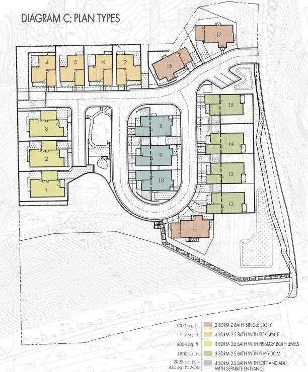 Community, Preservation and Sustainability are the core concepts for this California Density Bonus project, offering a very affordable unit and addressing missing middle housing needs through a variety of housing types and sizes. Anchored by a 300 year old Heritage Oak tree, residents will meet their neighbors at their community garden, a shared bike shed, or run into each other on the nature trail heading toward town. The project balances the preservation of natural site features while weaving a gentle density increase into a traditional single family neighborhood. All 17 zero lot line homes and 3 ADU’s have gracious front porches, single car garages and small private patios. They range from 1000 sq. ft. to 2000 sq. ft.